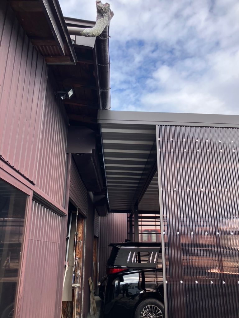 雨樋の真下にカーポートの屋根が綺麗に入り込み、シャッター全開にしてもカーポート屋根とは干渉しない絶妙な施工です。