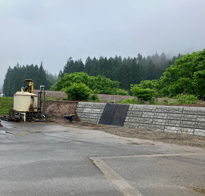 広い駐車場にカーポートを設置します。背後はすぐ山で土手になっておりますが、崩れないようにこの法面の舗装工事から始まりました。(こちらは施主様による工事)