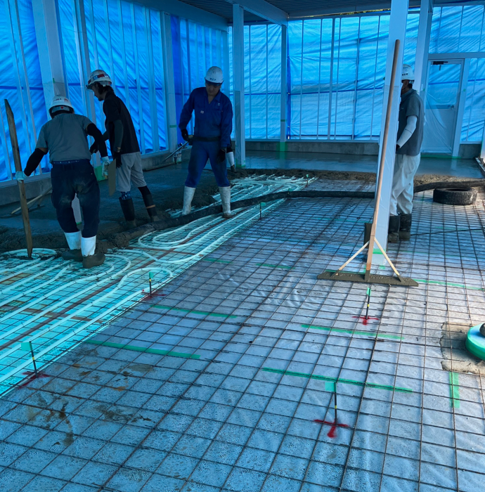 また、土間コンクリート下には一部ロードヒーティングもあり、他にも折板の上に瓦棒屋根、内部壁にはBEV(バッテリ式電動自動車)コンセントもあります。