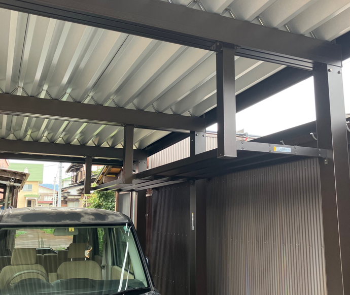 カーポートとしてはよくある1台用ですが、メーカーオプションの上吊り棚を取り付けました。
