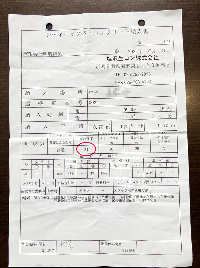 よって、きちんと軽量せず「勘」で配合した手練りコンクリートに正規の強度を保証できるか?と聞かれれば「できる」などとは言えませんし、お客さまにも自信を持って引き渡すことはできません。