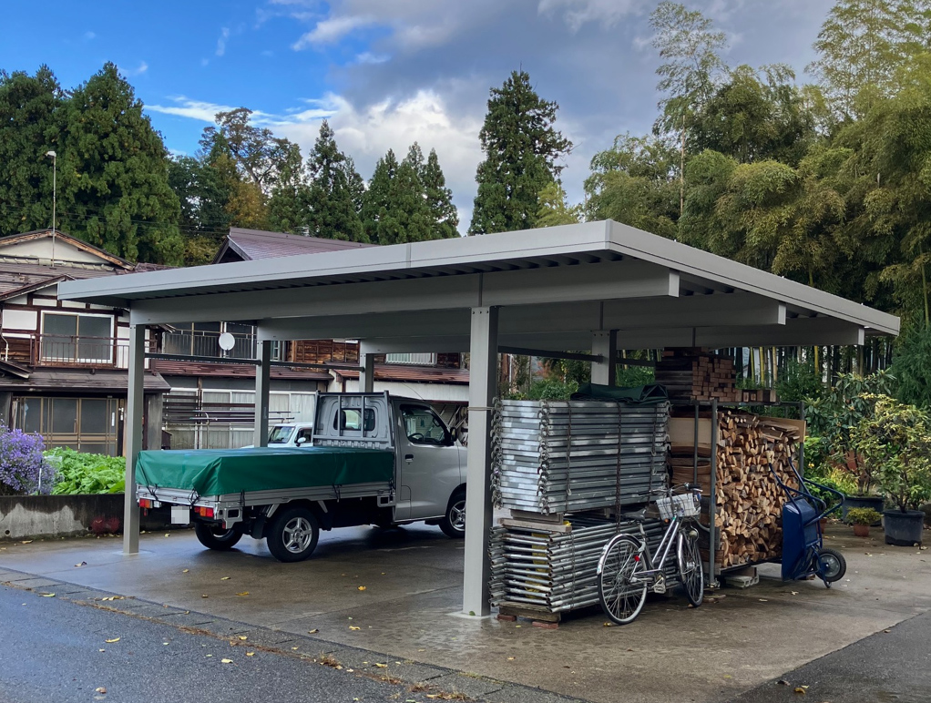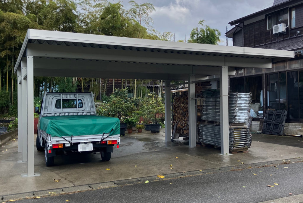 2台用カーポートの横に庇が出ているような(間口延長)タイプのカーポートをご提案させていただき、寸法を測ると敷地にぴったり!悩むことなく話が進み無事完成しました!